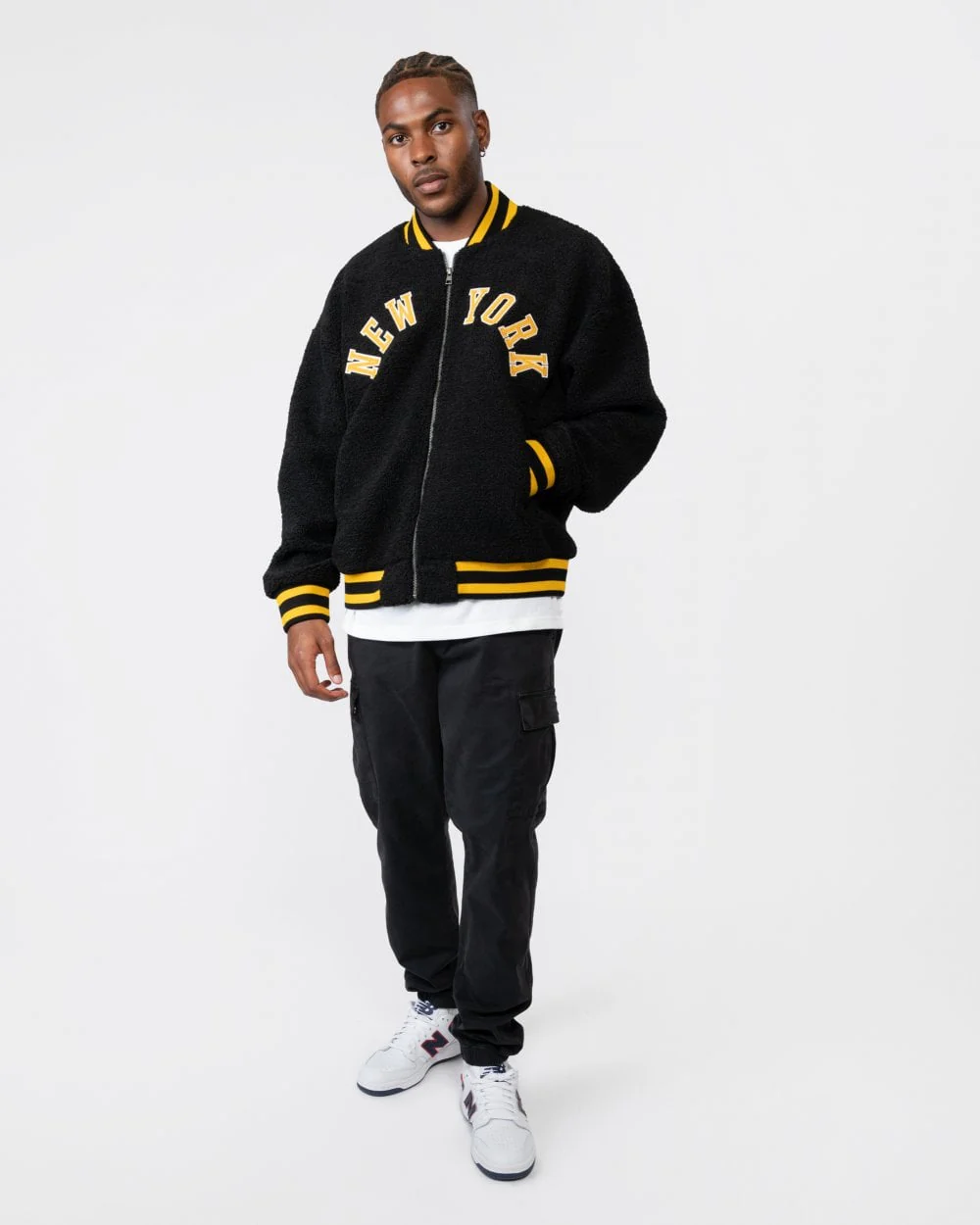 This varsity-inspired GANT jacket is a comfortable layer, adding extra warmth for the fall-winter months. Made from insulating teddy fleece and designed for an oversized fit, this jacket has a zipped front with two wide welt pockets. Taking notes from iconic letterman styles, it features ribbed detailing with yarn-dyed stripes at the collar, hem and cuffs, plus a bold ’New York' graphic embroidered at the chest in felt badges. This garment is intended for an oversized fit.